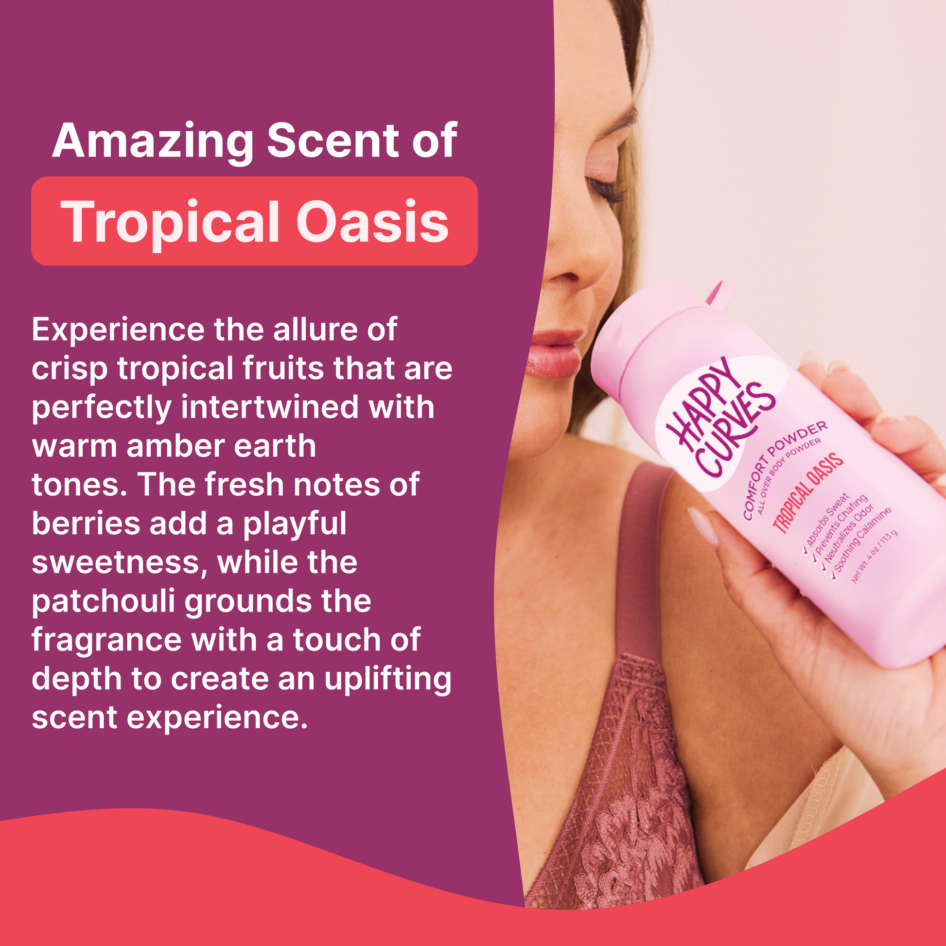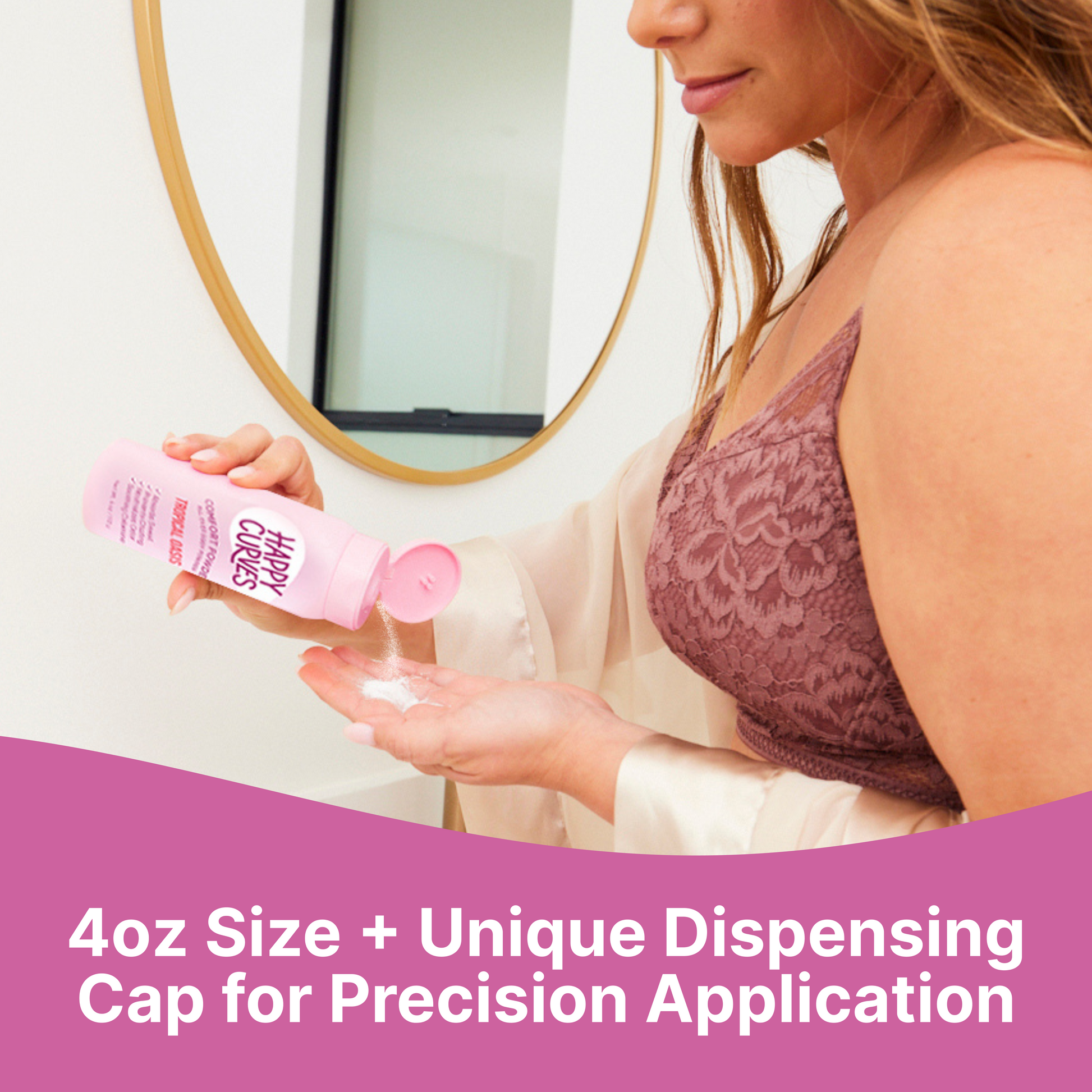 Talc-free 4oz body powder provides all-day comfort by absorbing sweat and preventing chafing. Leaves a nice subtle fragrance to subdue odor. Innovative dispensing cap for targeted application. Our formula is enriched with Aloe, Coconut Oil, and Chamomile to soothe your skin and provide all-day comfort.