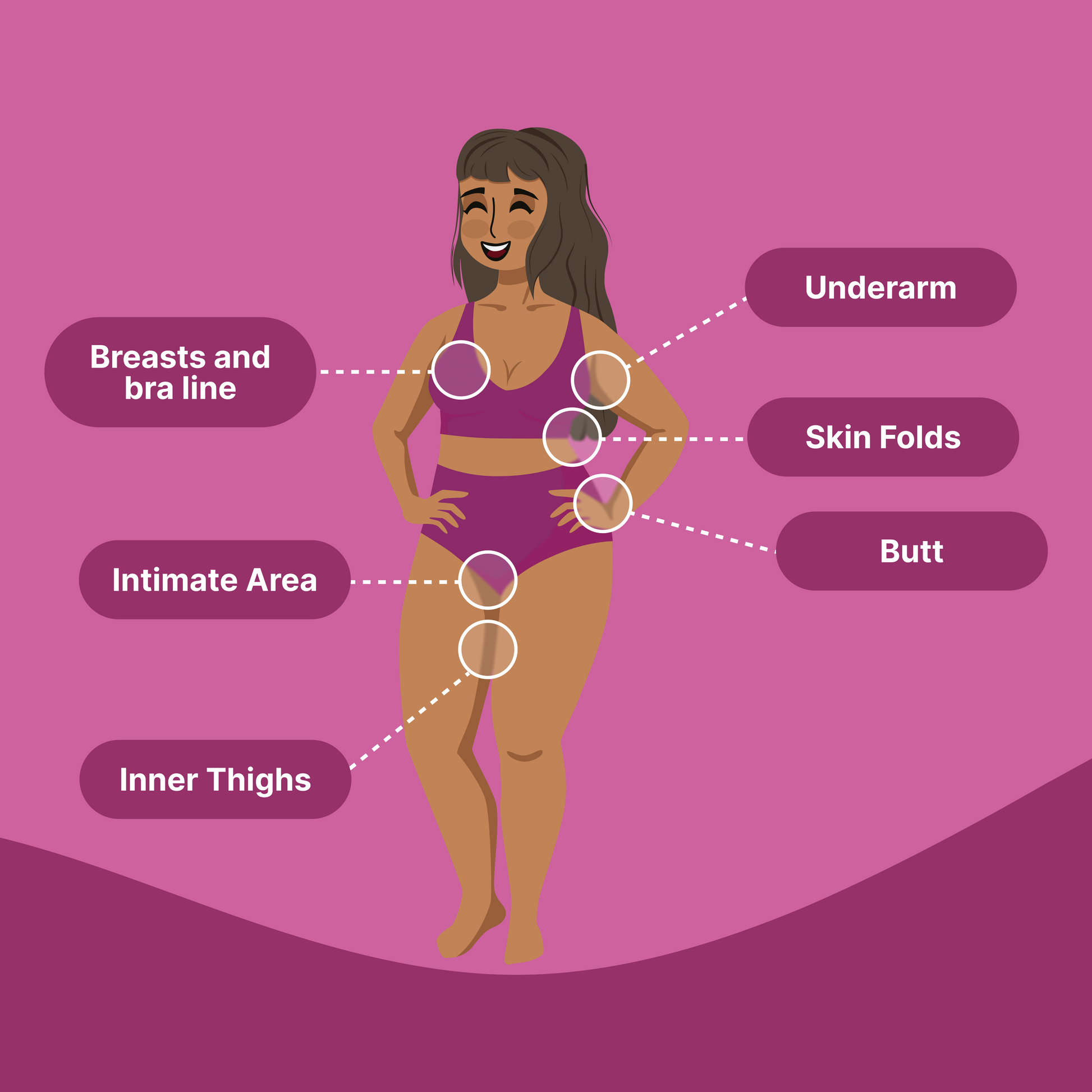 Happy Curves products are safe to use all over. We suggest any spots on your body that are high friction, high heat, and prone to extra sweating but the ingredients are safe for intimate areas and more.